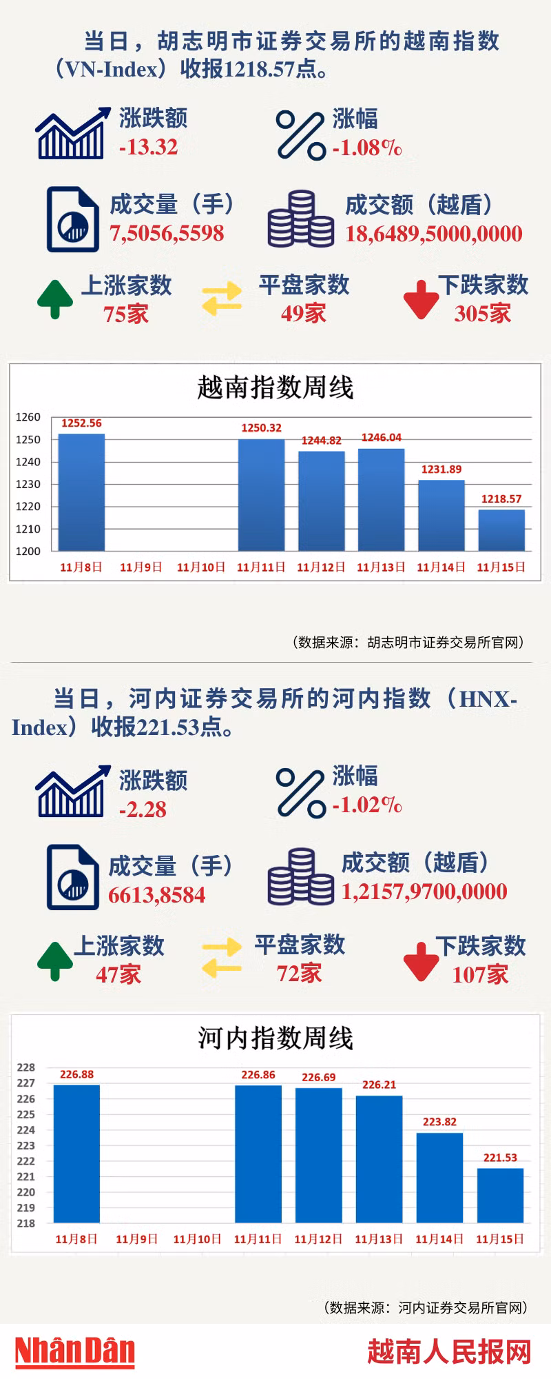 当天,胡志明市证券交易所的越南指数(VN-Index)和河内证券交易所的河内指数(HNX-Index)分别收报1218.57点和221.53点。