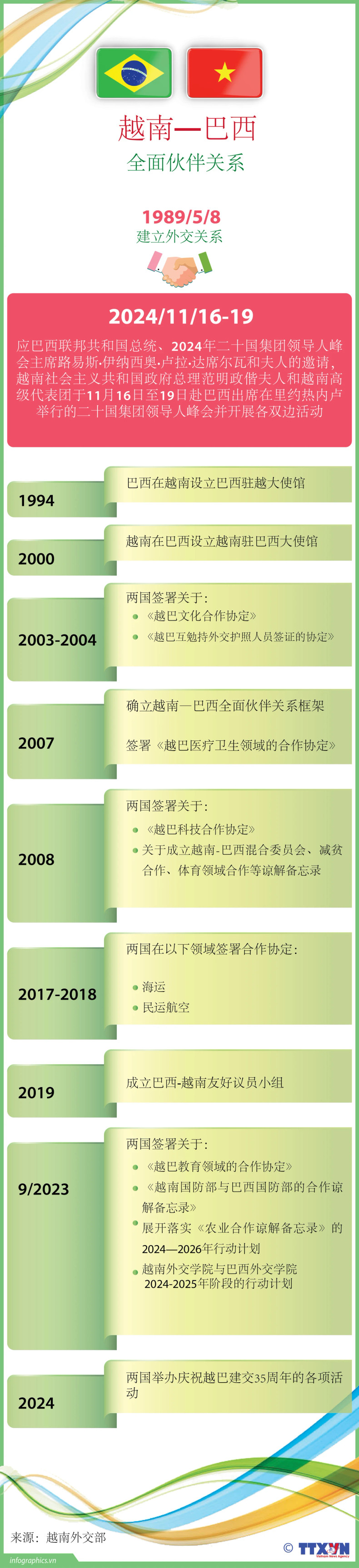 应巴西联邦共和国总统、2024年二十国集团领导人会议主席路易斯·伊纳西奥·卢拉·达席尔瓦和夫人的邀请,越南社会主义共和国政府总理范明正偕夫人和越南高级代表团于11月16日至19日赴巴西出席在里约热内卢举行的二十国集团领导人会议并开展各双边活动