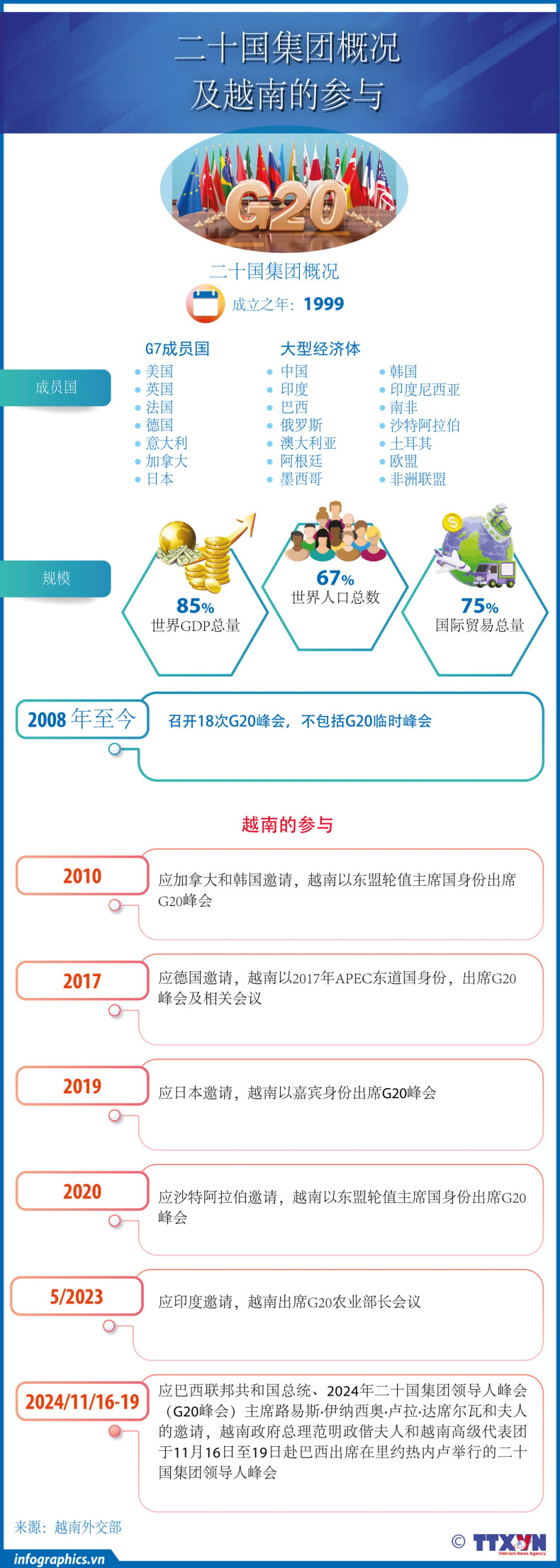 应巴西联邦共和国总统、2024年二十国集团领导人峰会主席路易斯·伊纳西奥·卢拉·达席尔瓦和夫人的邀请,越南政府总理范明正偕夫人和越南高级代表团于11月16日至19日赴巴西出席在里约热内卢举行的二十国集团领导人峰会。