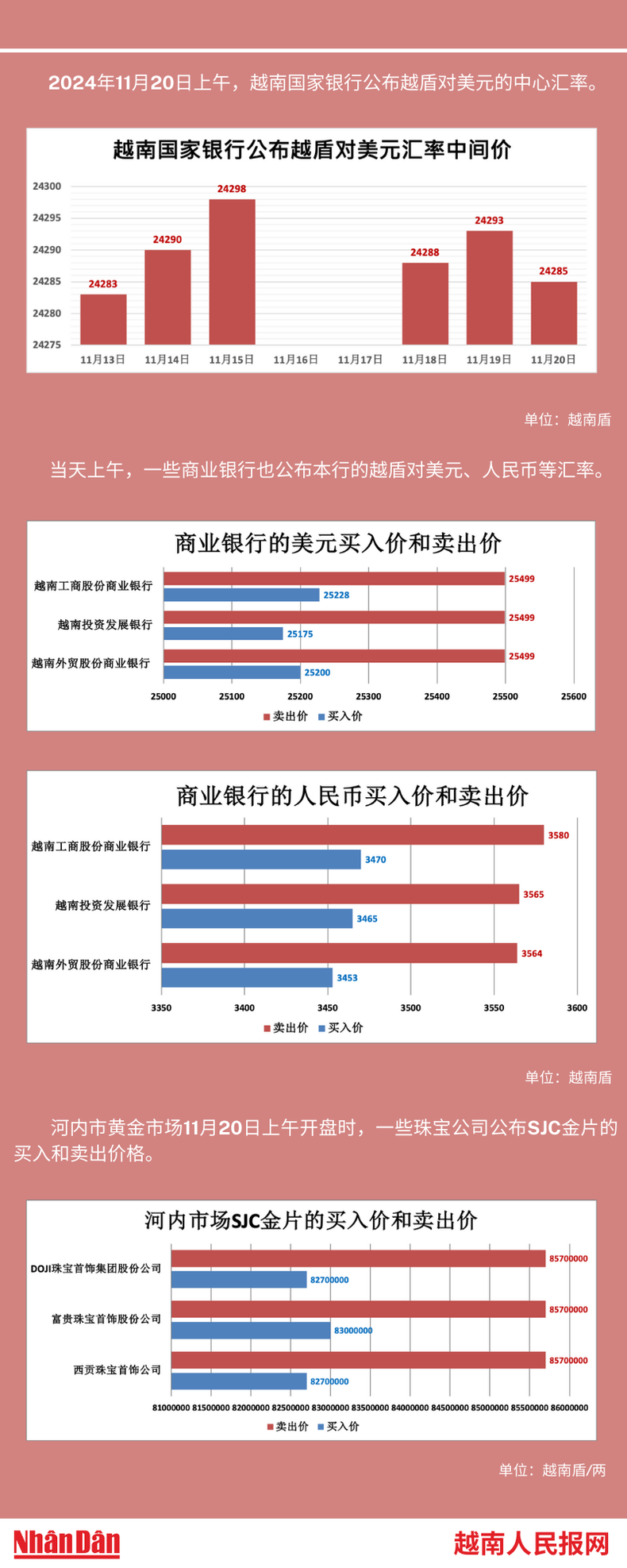 2024年11月20日上午,越南国家银行所公布的越盾对美元的中心汇率为24285。