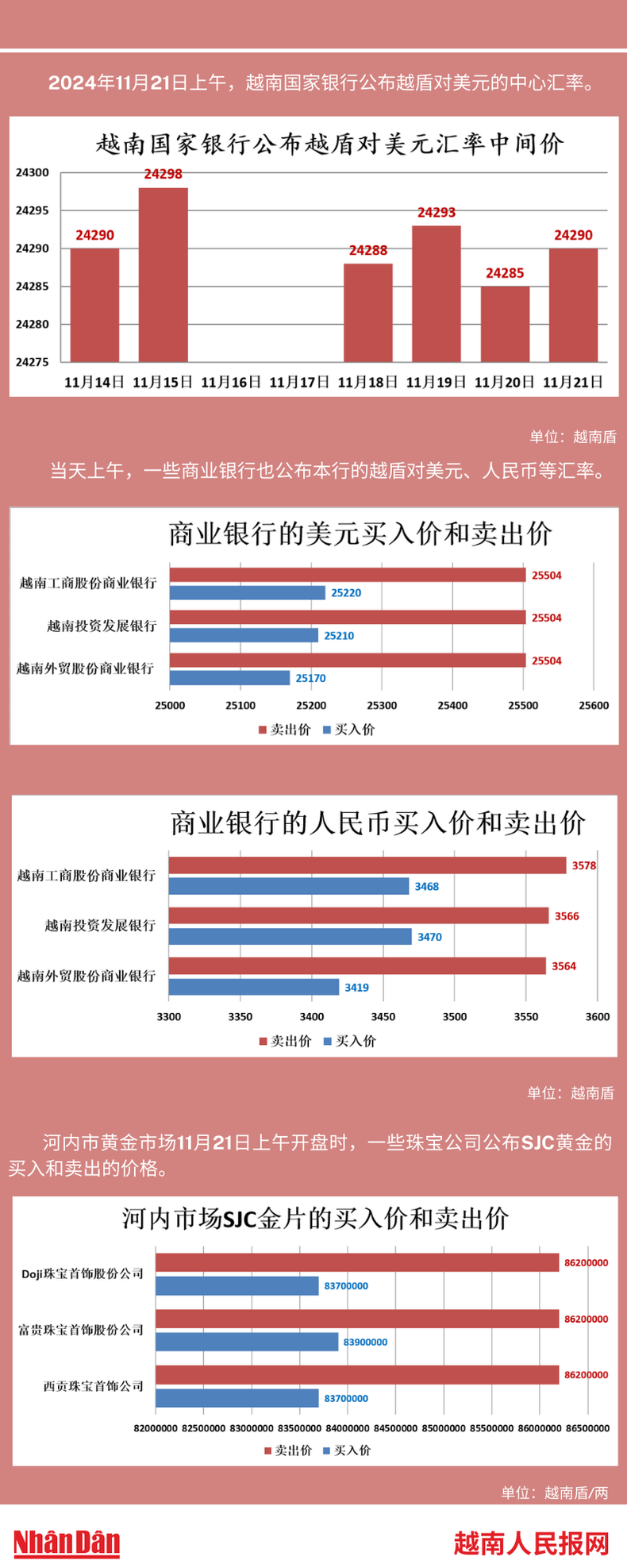 2024年11月21日上午,越南国家银行所公布的越盾对美元的中心汇率为24290。