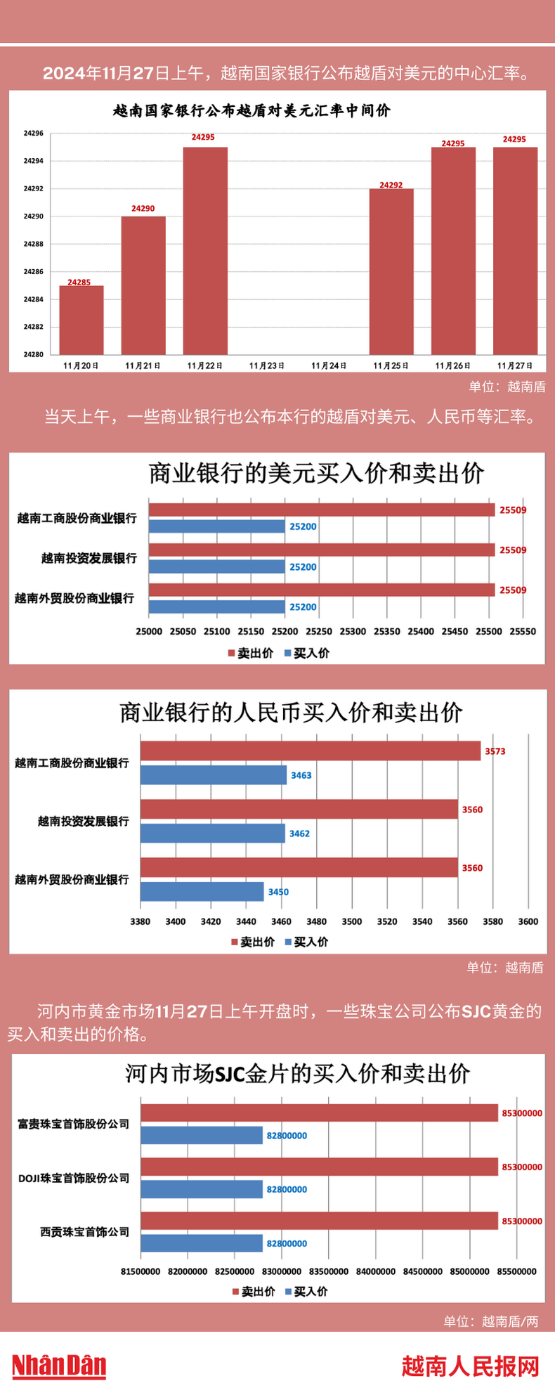 2024年11月27日上午,越南国家银行所公布的越盾对美元的中心汇率为24295。