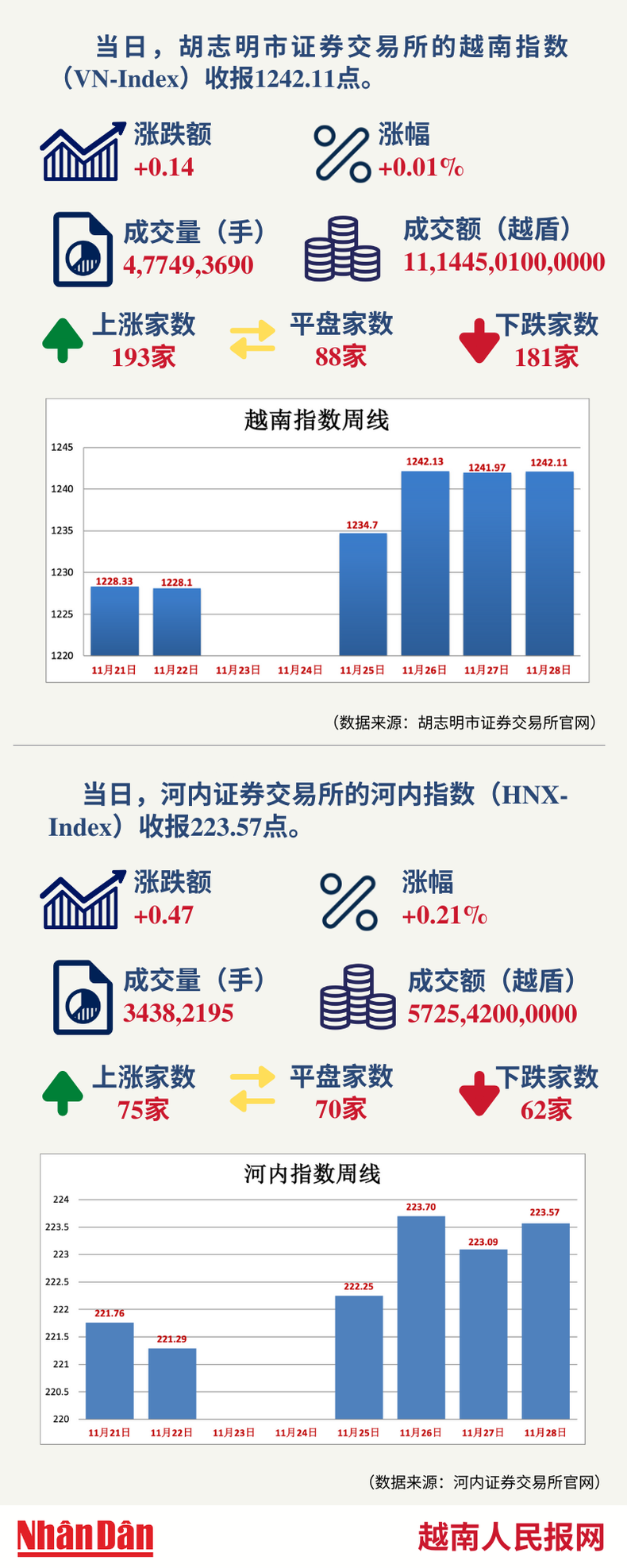 当天,胡志明市证券交易所的越南指数(VN-Index)和河内证券交易所的河内指数(HNX-Index)分别收报1242.11点和223.57点。