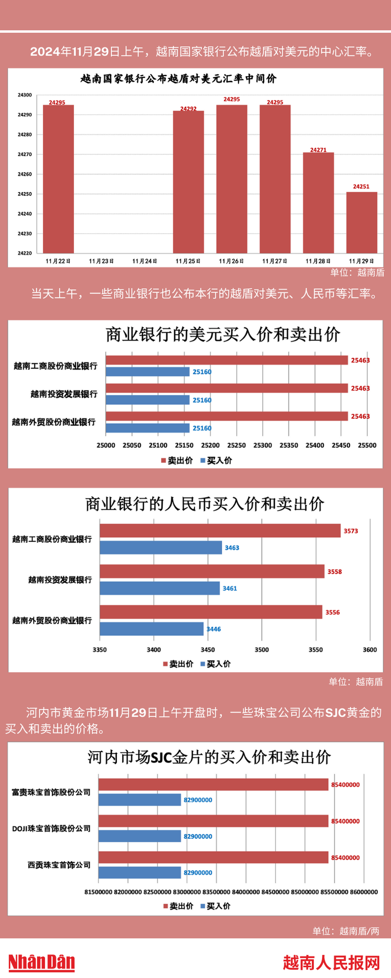 2024年11月29日上午,越南国家银行所公布的越盾对美元的中心汇率为24251。