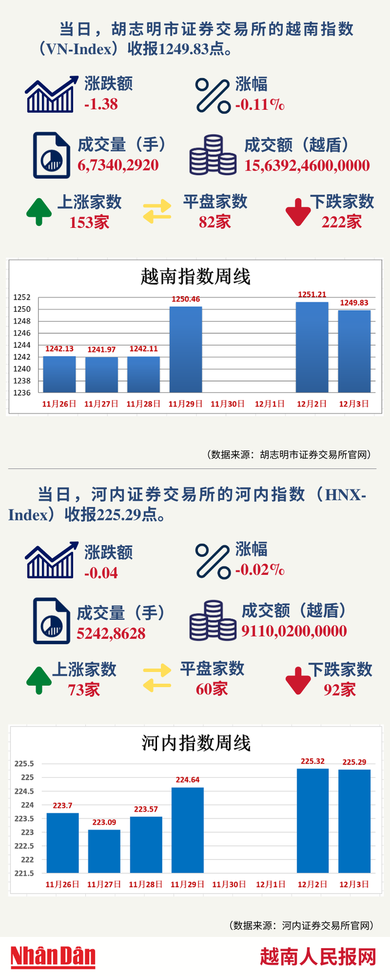 当天,胡志明市证券交易所的越南指数(VN-Index)和河内证券交易所的河内指数(HNX-Index)分别收报1249.83点和225.29点。