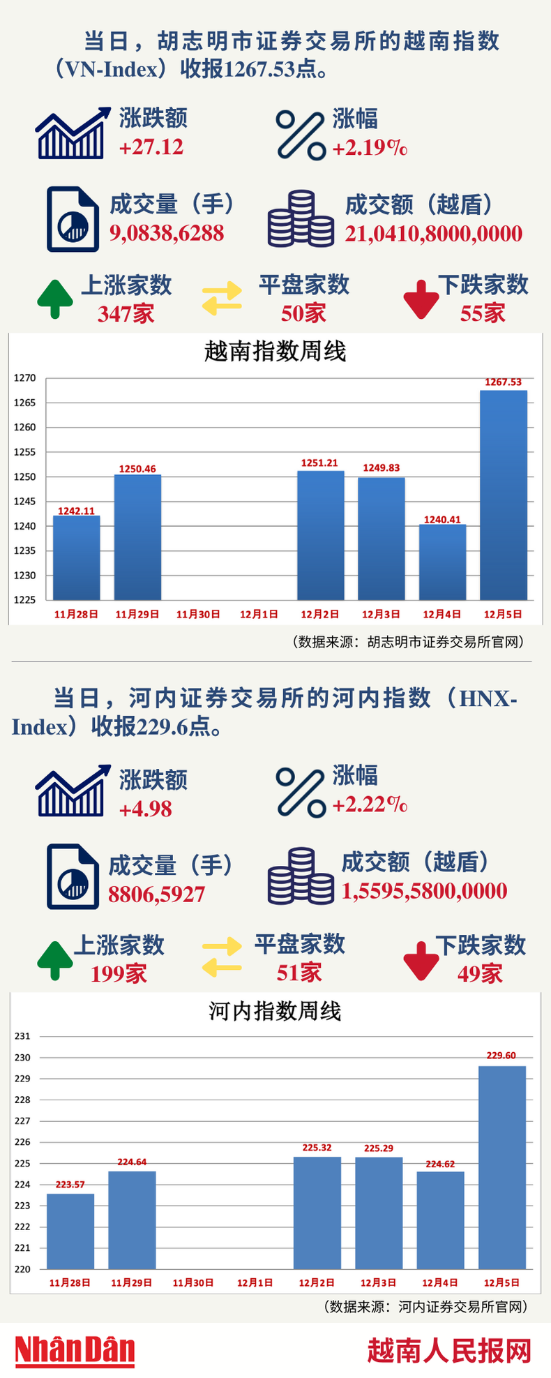 当天,胡志明市证券交易所的越南指数(VN-Index)和河内证券交易所的河内指数(HNX-Index)分别收报1267.53点和229.6点。