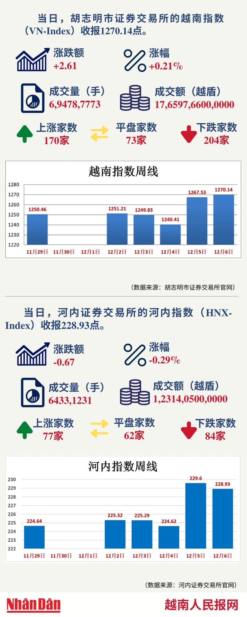 当天,胡志明市证券交易所的越南指数(VN-Index)和河内证券交易所的河内指数(HNX-Index)分别收报1270.14点和228.93点。