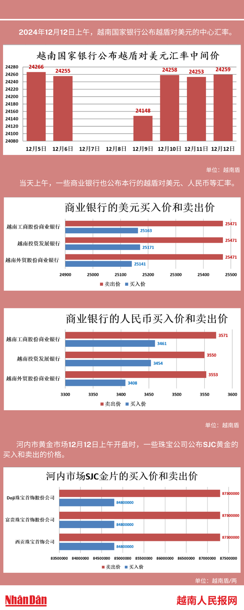 2024年12月12日上午,越南国家银行所公布的越盾对美元的中心汇率为24259。