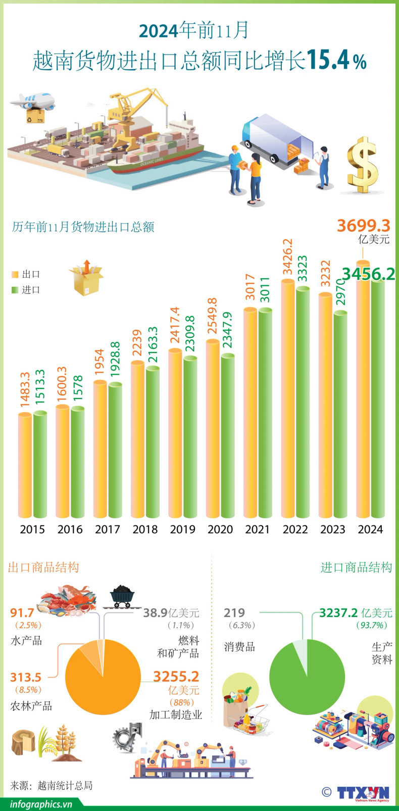 2024年前11月越南货物进出口总额同比增长15.4%【图表新闻】