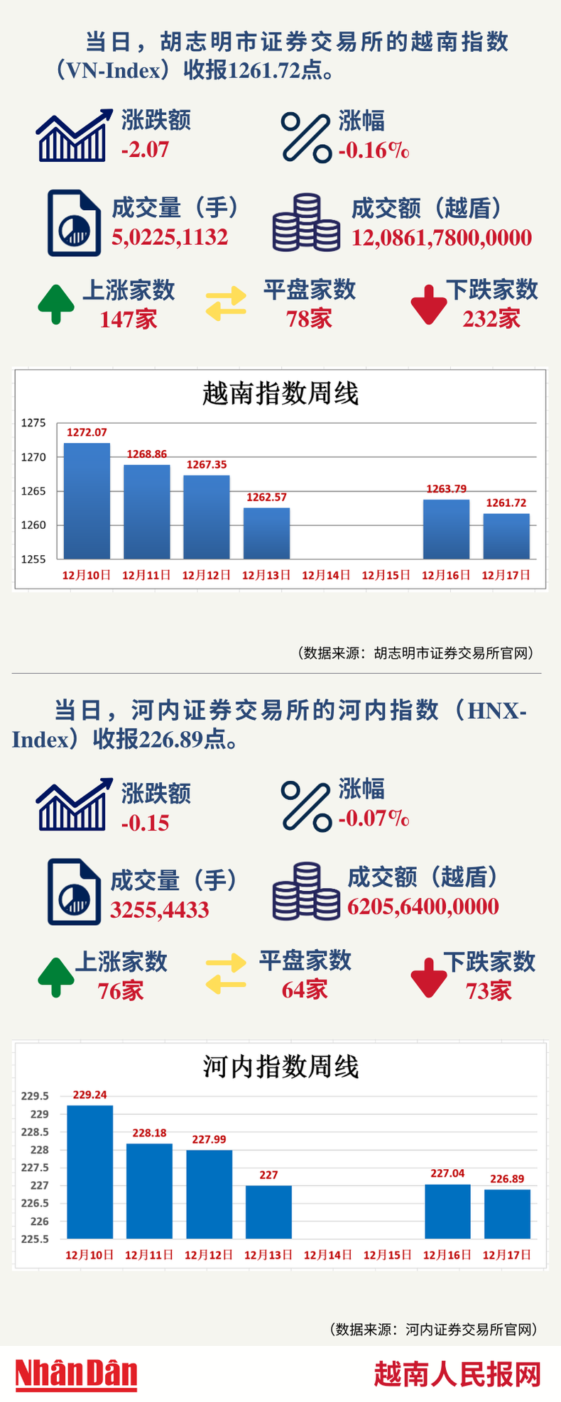 当天,胡志明市证券交易所的越南指数(VN-Index)和河内证券交易所的河内指数(HNX-Index)分别收报1261.72点和226.89点。
