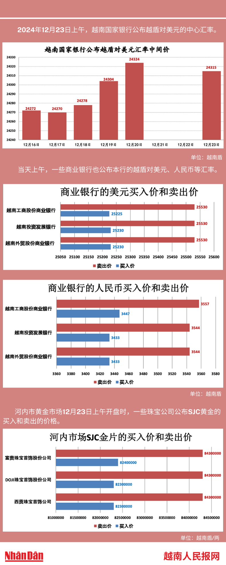2024年12月23日上午,越南国家银行所公布的越盾对美元的中心汇率为24315。