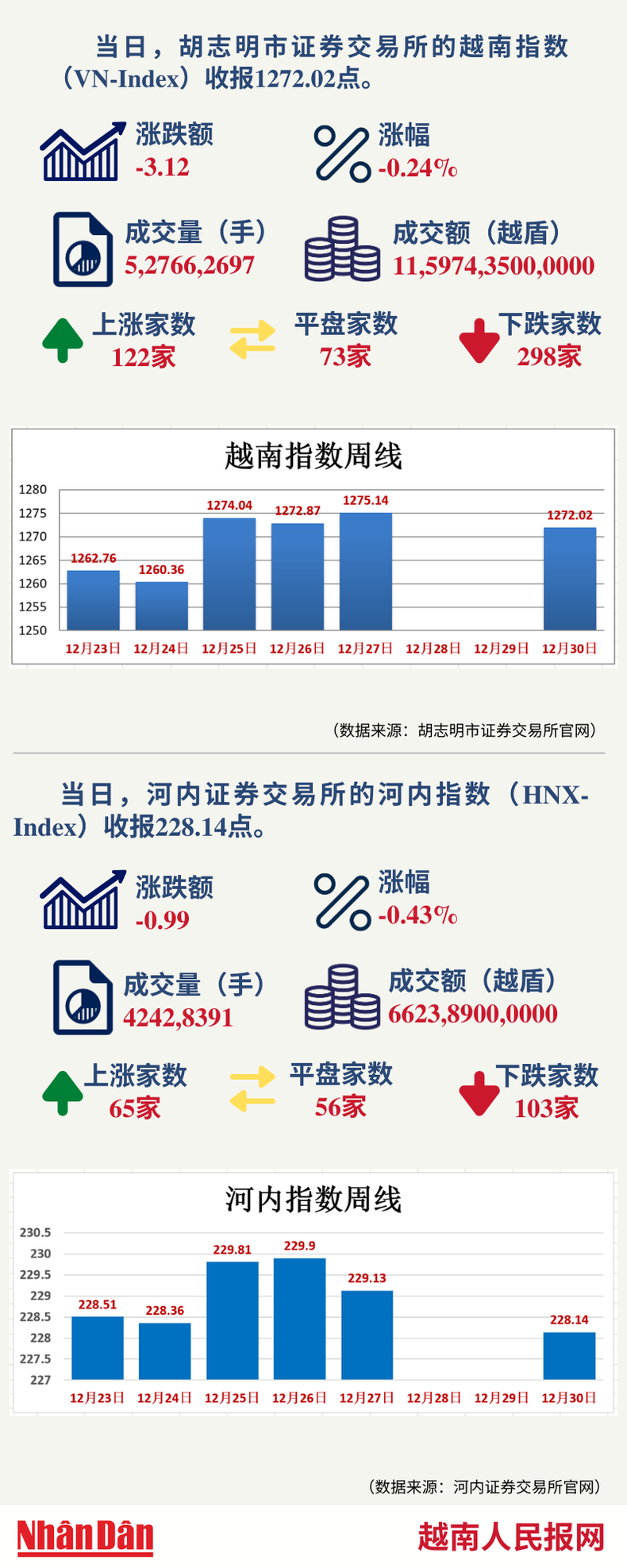 2025年12月04日星期四 18:31 12月4日越南证券市场数据一览 【图表新闻】 当天,胡志明市证券交易所的越南指数(VN-Index)和河内证券交易所的河内指数(HNX-Index)分别收报1737.24点和262.31点。