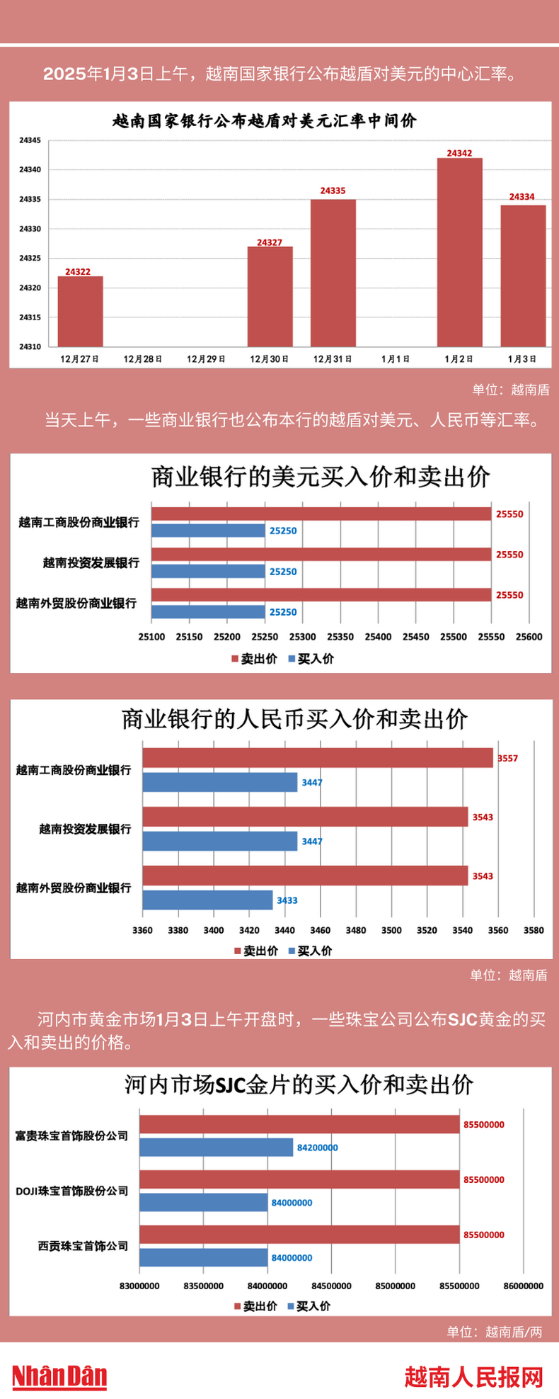 2025年1月3日上午,越南国家银行所公布的越盾对美元的中心汇率为24334。