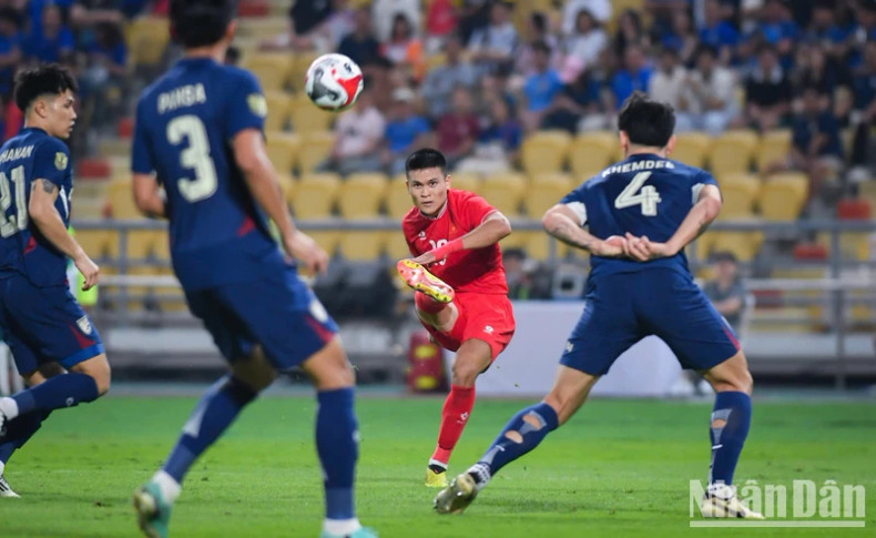 首回合1-2落后于越南队,作为主队的泰国队从比赛一开始就施压对手,在前场逼抢,寸土不让。不过第8分钟却遭泼冷水。越南队获得任意球,春孟发球,前锋俊海晃过后卫,抢点把球打进大门,越南队1-0领先。