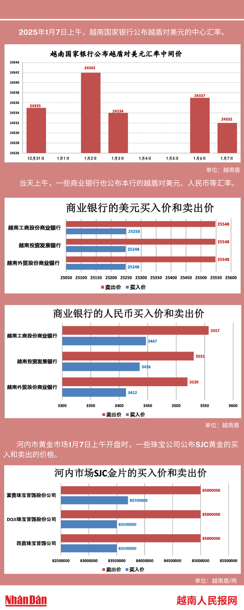 2025年1月7日上午,越南国家银行所公布的越盾对美元的中心汇率为24332。