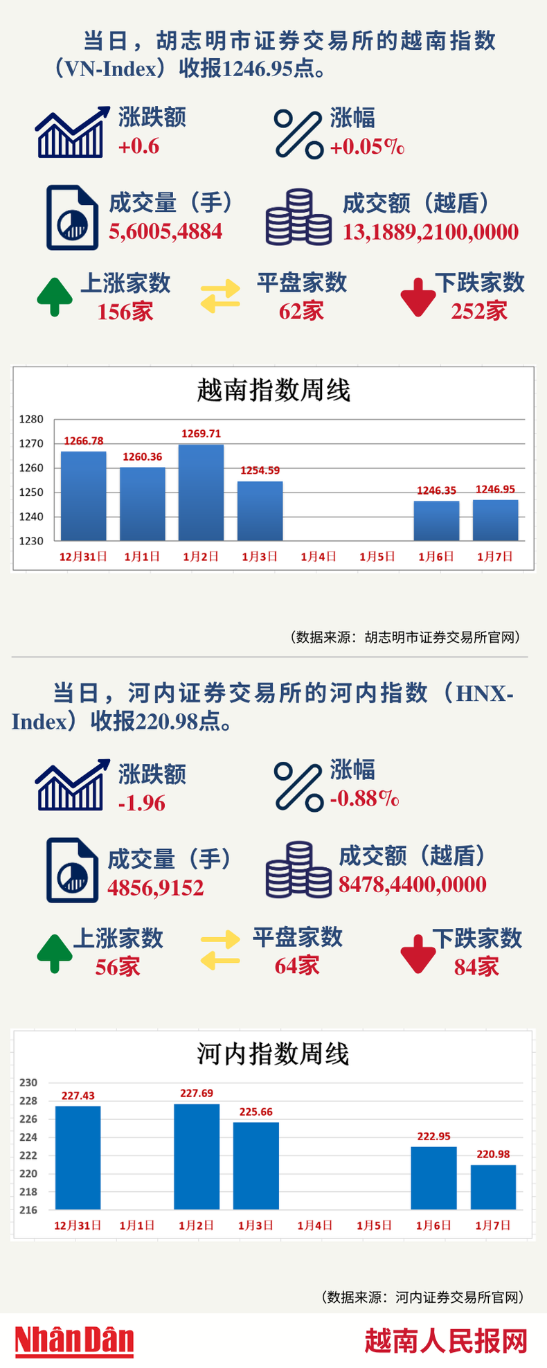 当天,胡志明市证券交易所的越南指数(VN-Index)和河内证券交易所的河内指数(HNX-Index)分别收报1246.95点和220.98点。