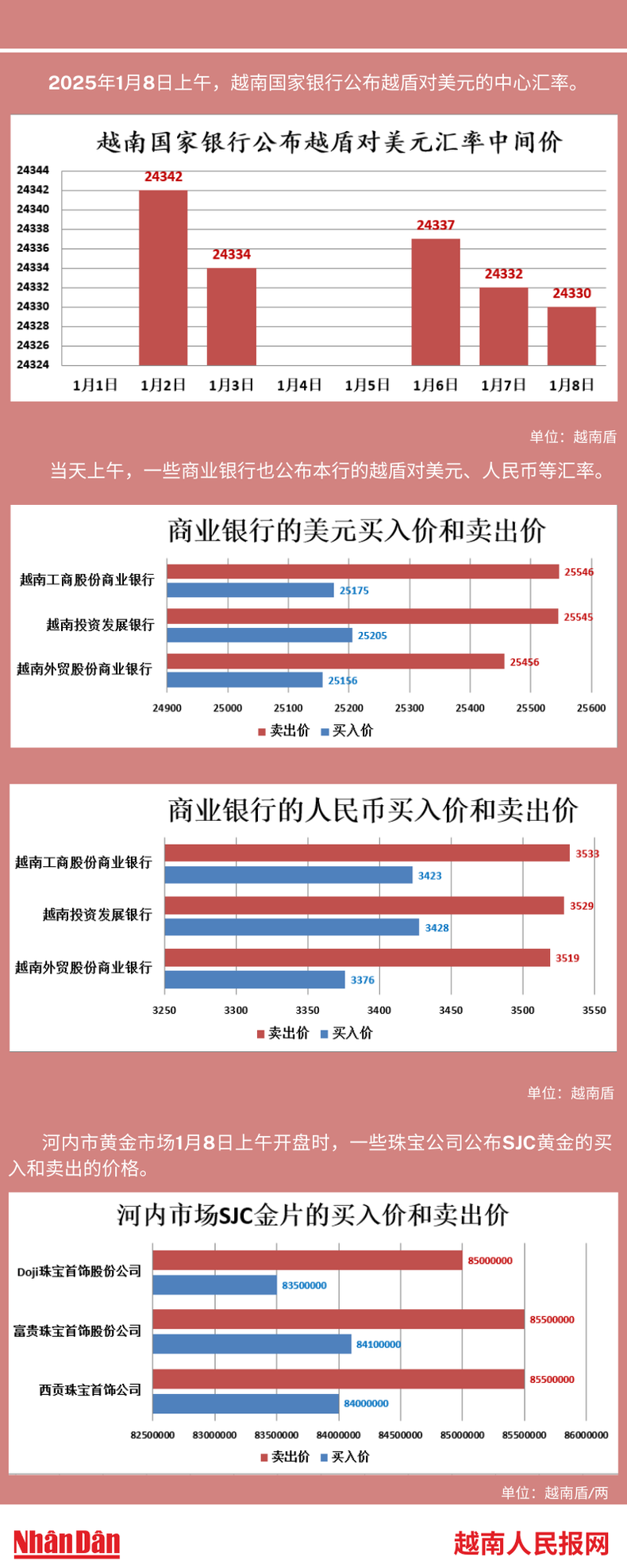 2025年1月8日上午,越南国家银行所公布的越盾对美元的中心汇率为24330。