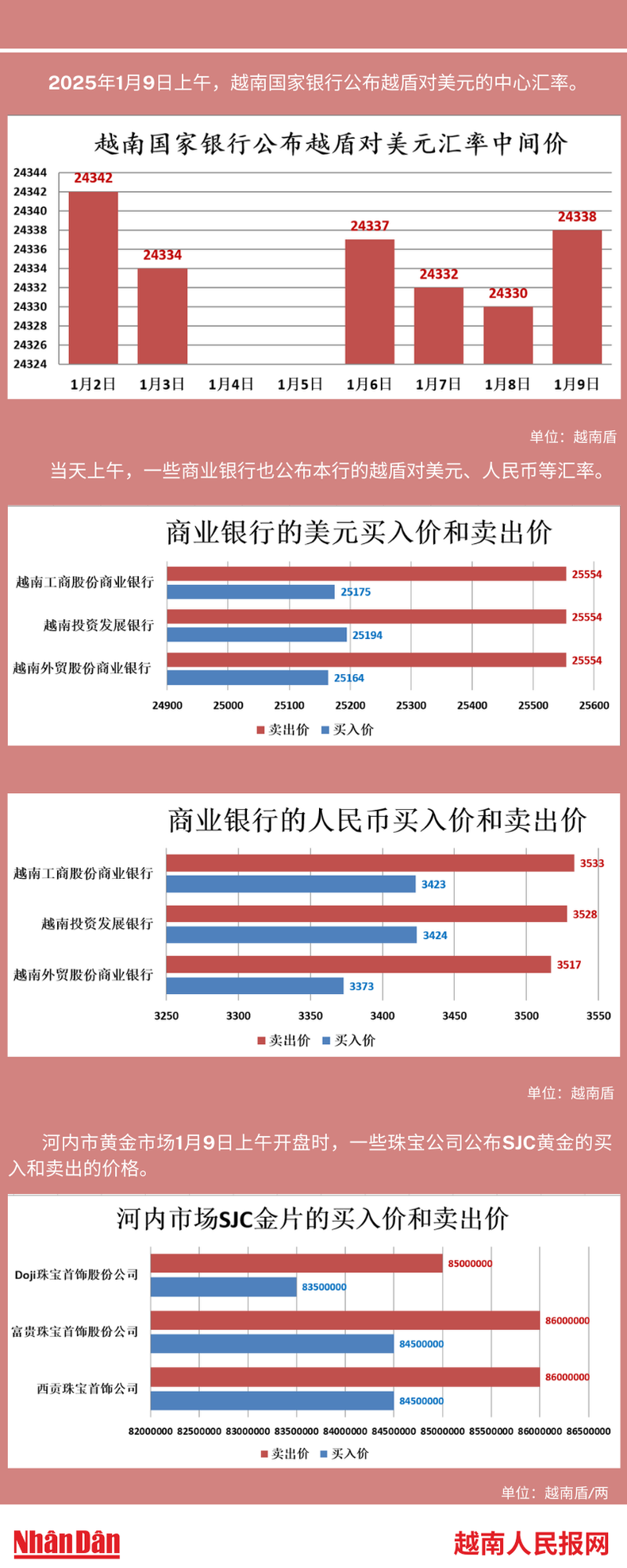 2025年1月9日上午,越南国家银行所公布的越盾对美元的中心汇率为24338。