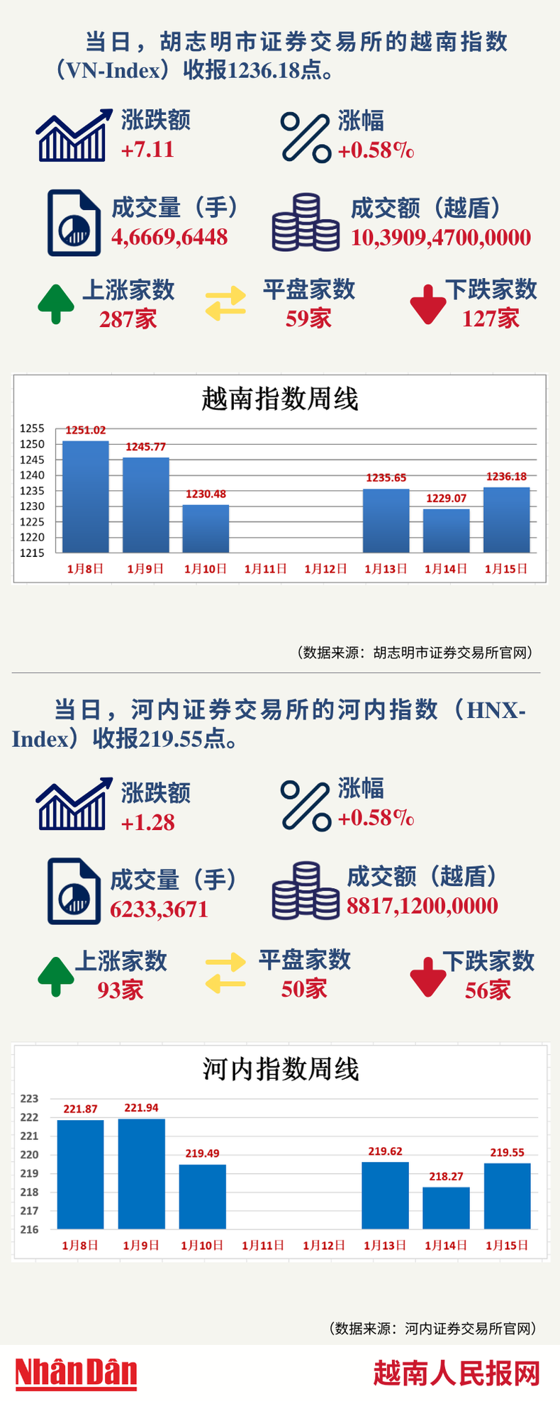 当天,胡志明市证券交易所的越南指数(VN-Index)和河内证券交易所的河内指数(HNX-Index)分别收报1236.18点和219.55点。