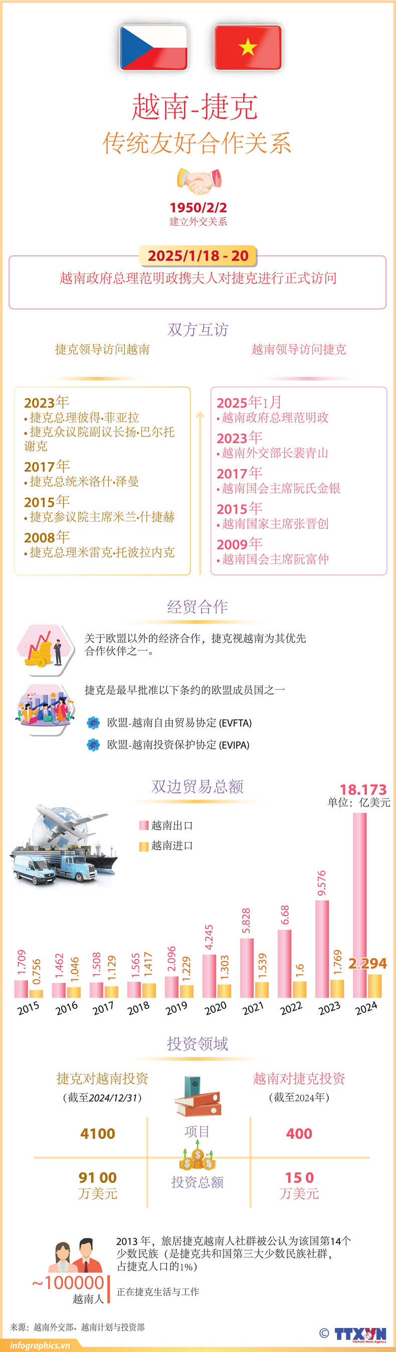 应捷克总理彼得·菲亚拉的邀请,越南政府总理范明正携夫人率越南高级代表团于2025年1月18日至20日对捷克共和国进行正式访问。此访正值两国建交75周年(1950年2月2日至2025年2月2日),因此具有特殊意义,有望为推动越捷两国传统友谊和多方面合作关系迈上新台阶创造动力。