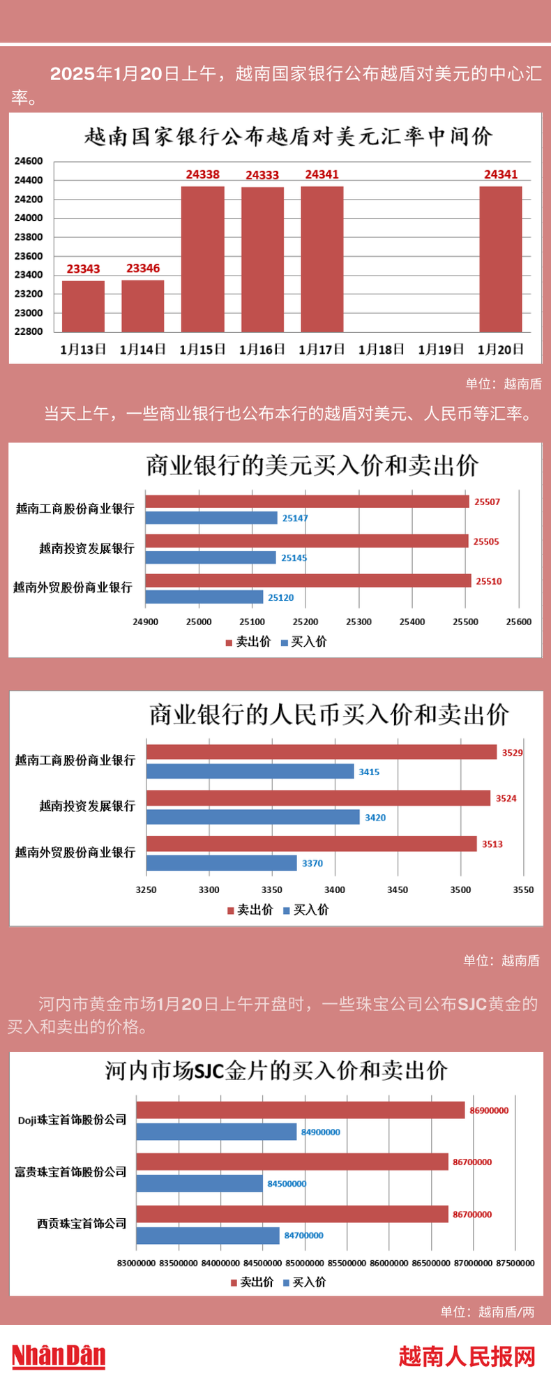 2025年1月20日上午,越南国家银行所公布的越盾对美元的中心汇率为24341。