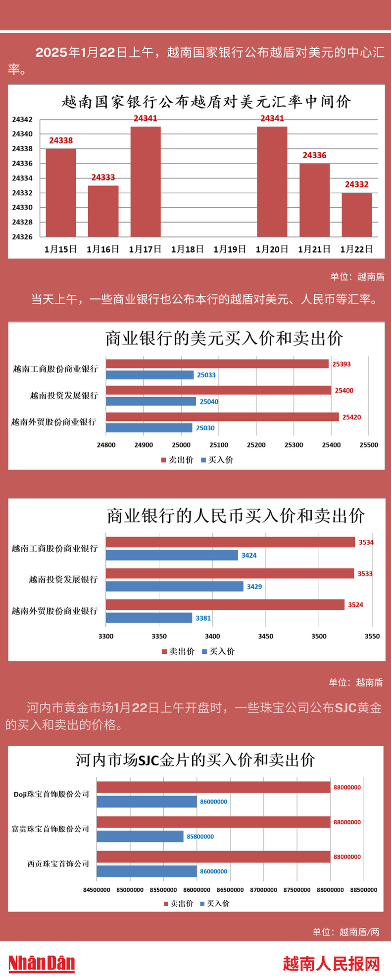 2025年1月22日上午,越南国家银行所公布的越盾对美元的中心汇率为24332。