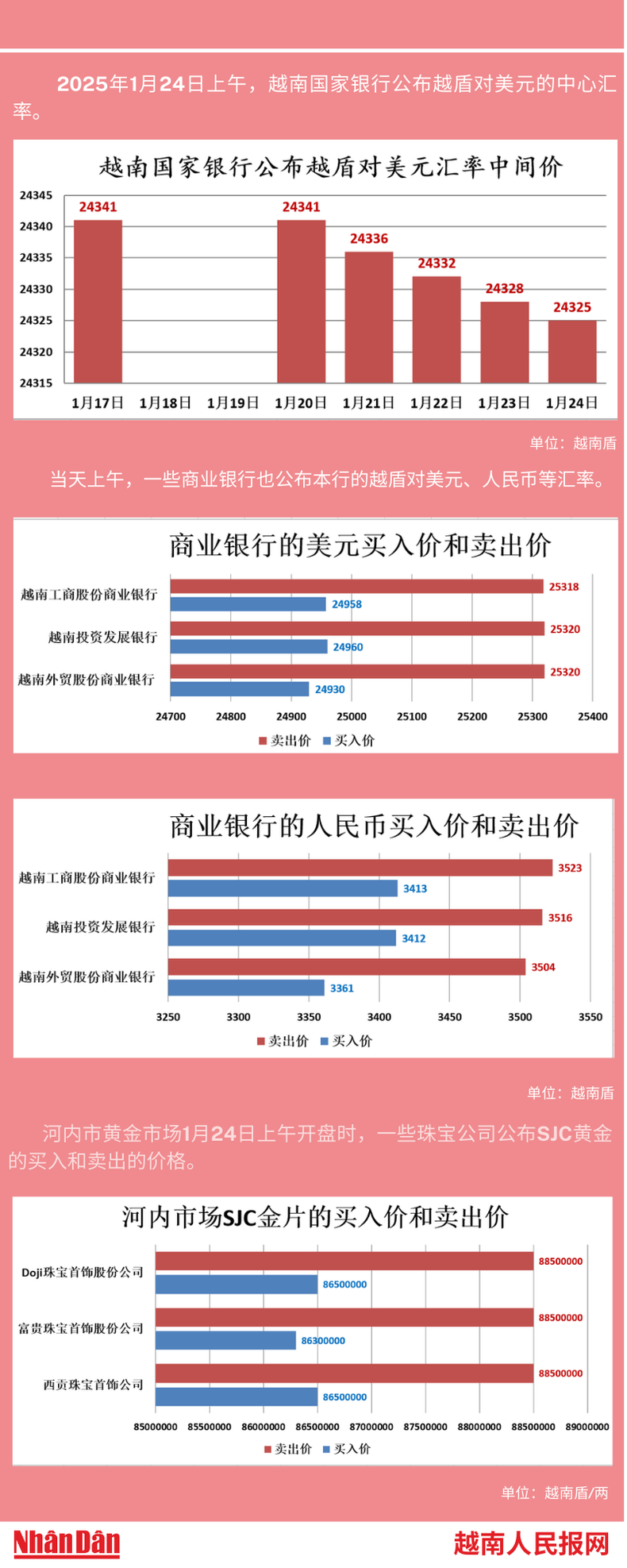 2025年1月24日上午,越南国家银行所公布的越盾对美元的中心汇率为24325。