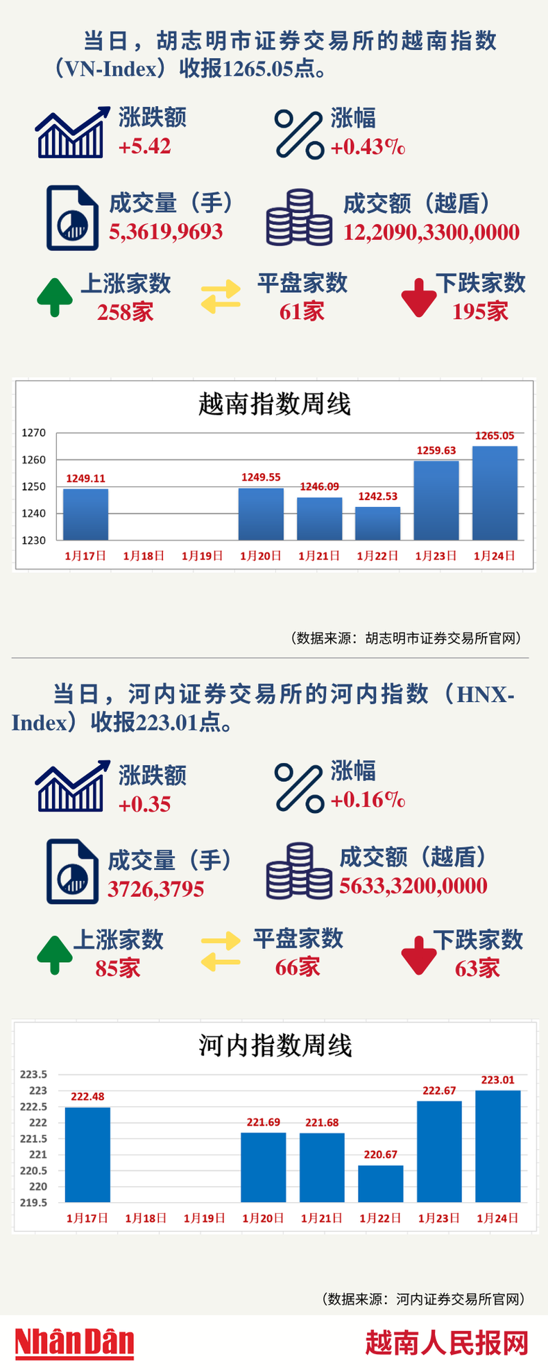 当天,胡志明市证券交易所的越南指数(VN-Index)和河内证券交易所的河内指数(HNX-Index)分别收报1265.05点和223.01点。