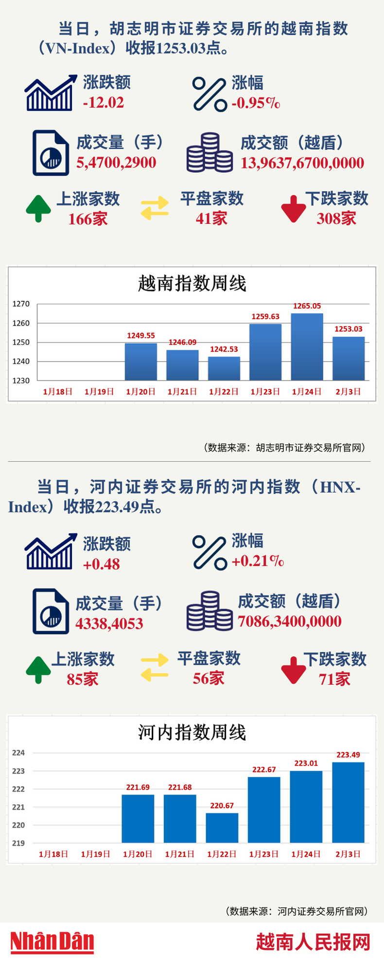 当天,胡志明市证券交易所的越南指数(VN-Index)和河内证券交易所的河内指数(HNX-Index)分别收报1253.03点和223.49点。