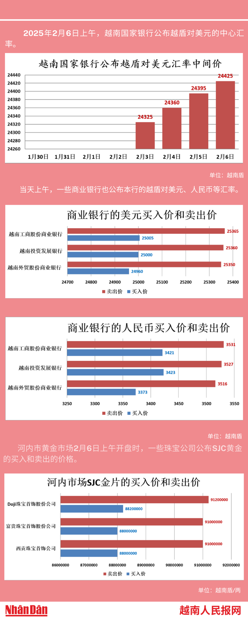 2025年2月6日上午,越南国家银行所公布的越盾对美元的中心汇率为24425。