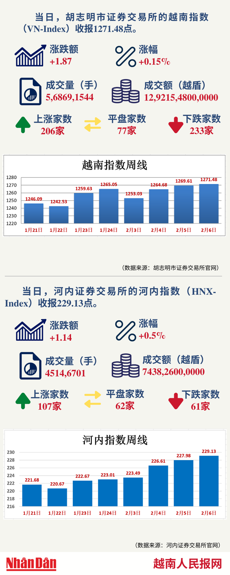 当天,胡志明市证券交易所的越南指数(VN-Index)和河内证券交易所的河内指数(HNX-Index)分别收报1271.48点和229.13点。