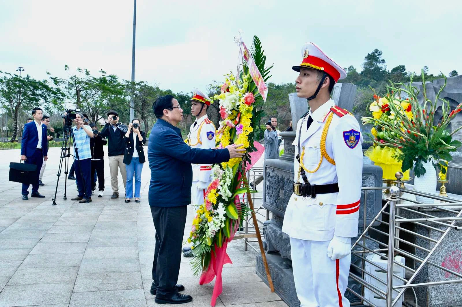 范明正总理一行带上花圈,敬香缅怀英雄烈士和越南英雄母亲。