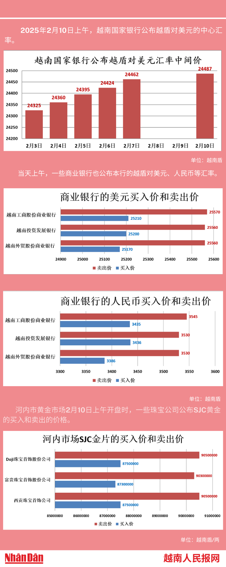 2025年2月10日上午,越南国家银行所公布的越盾对美元的中心汇率为24487。