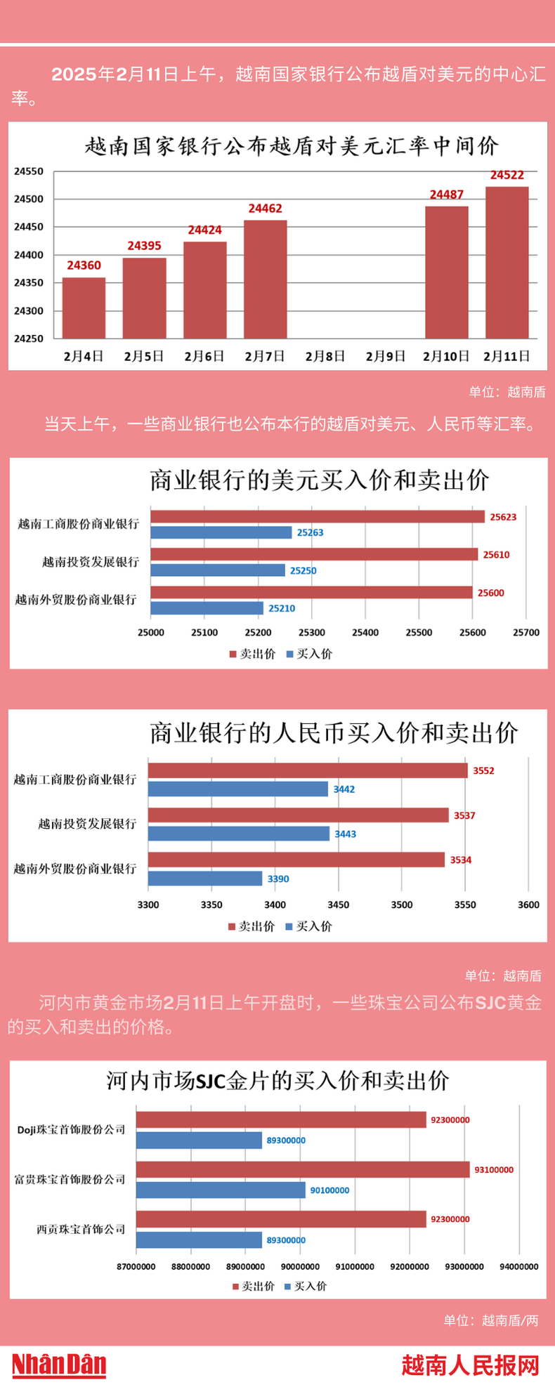 2025年2月11日上午,越南国家银行所公布的越盾对美元的中心汇率为24522。