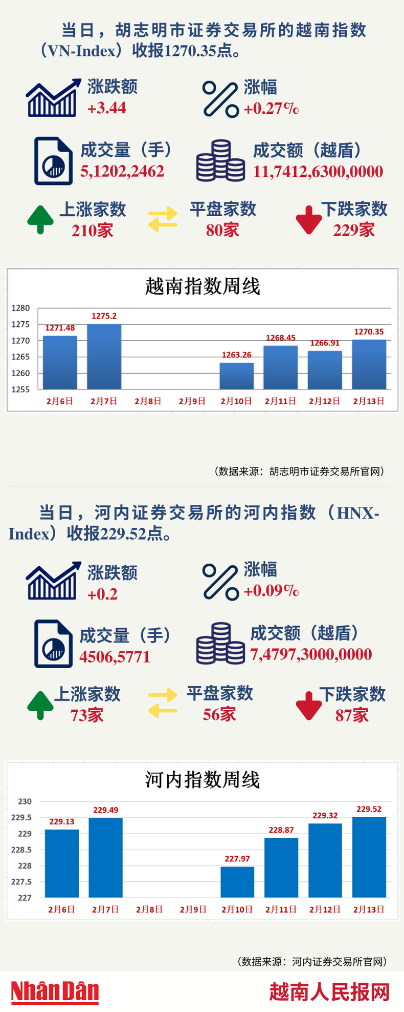 当天,胡志明市证券交易所的越南指数(VN-Index)和河内证券交易所的河内指数(HNX-Index)分别收报1270.35点和229.52点。