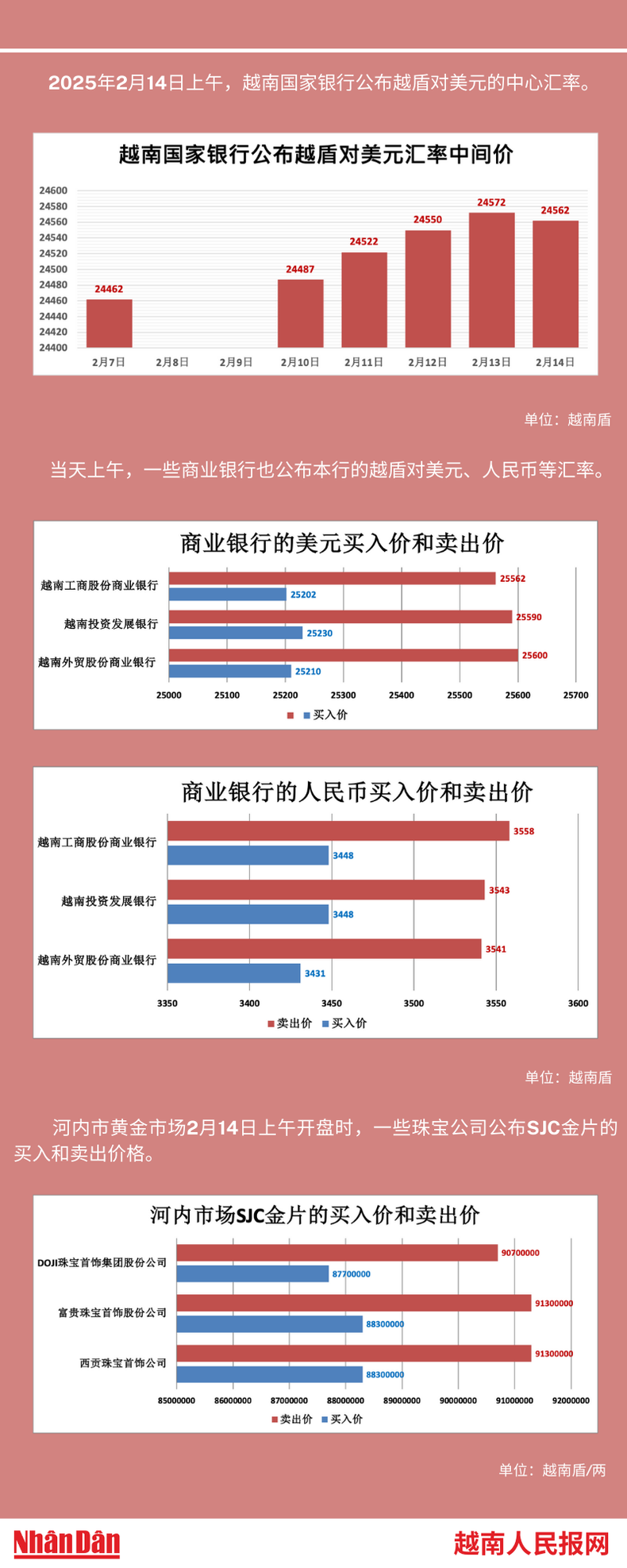 2025年2月14日上午,越南国家银行所公布的越盾对美元的中心汇率为24562。