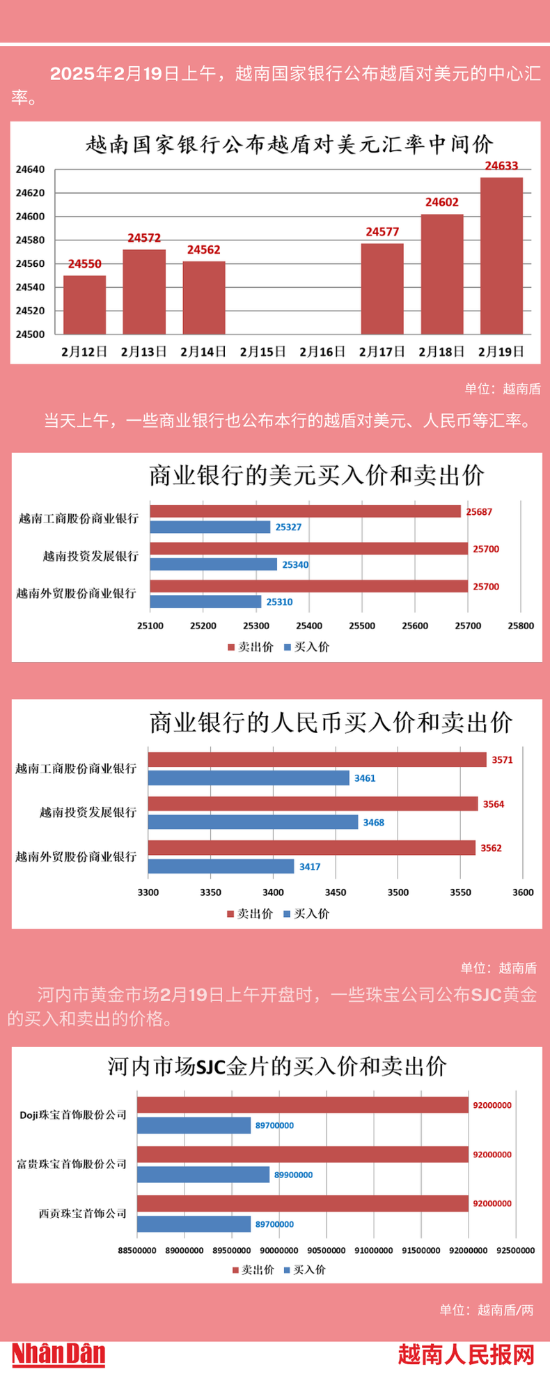 2025年2月19日上午,越南国家银行所公布的越盾对美元的中心汇率为24633。