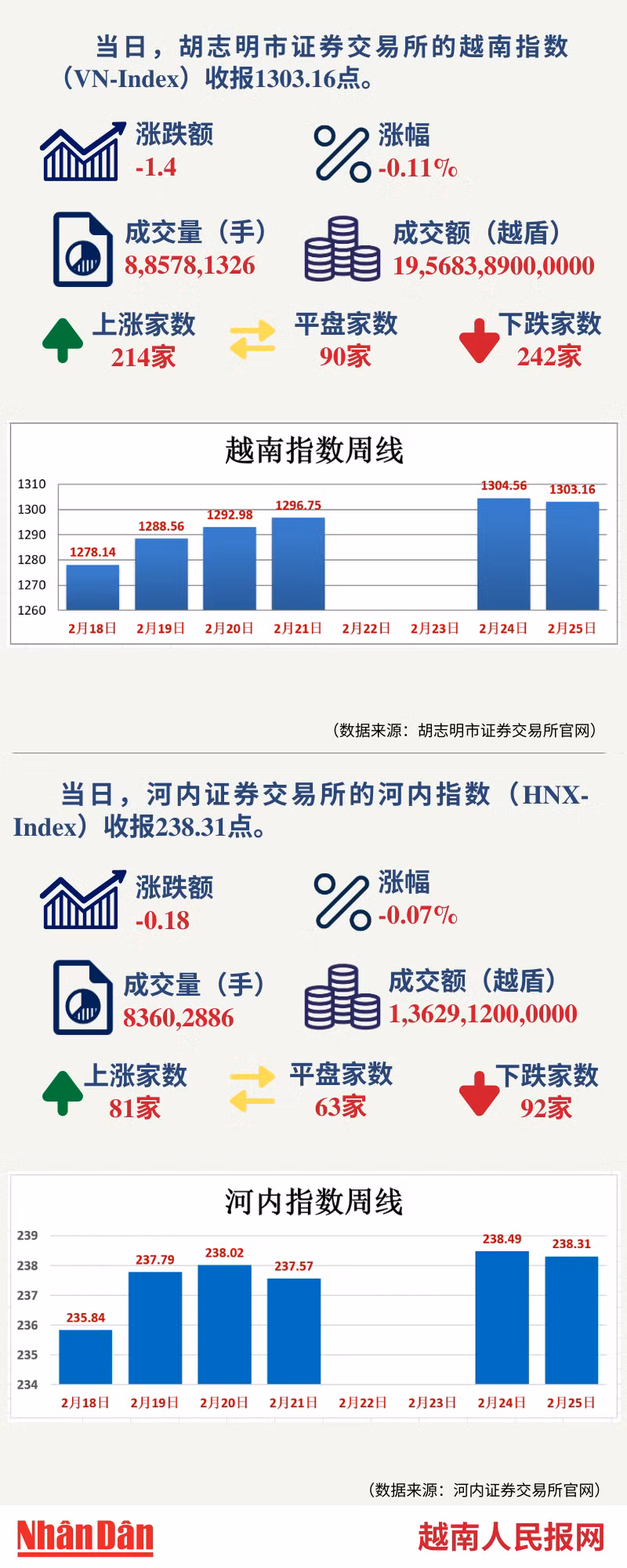 当天,胡志明市证券交易所的越南指数(VN-Index)和河内证券交易所的河内指数(HNX-Index)分别收报1303.16点和238.31点。
