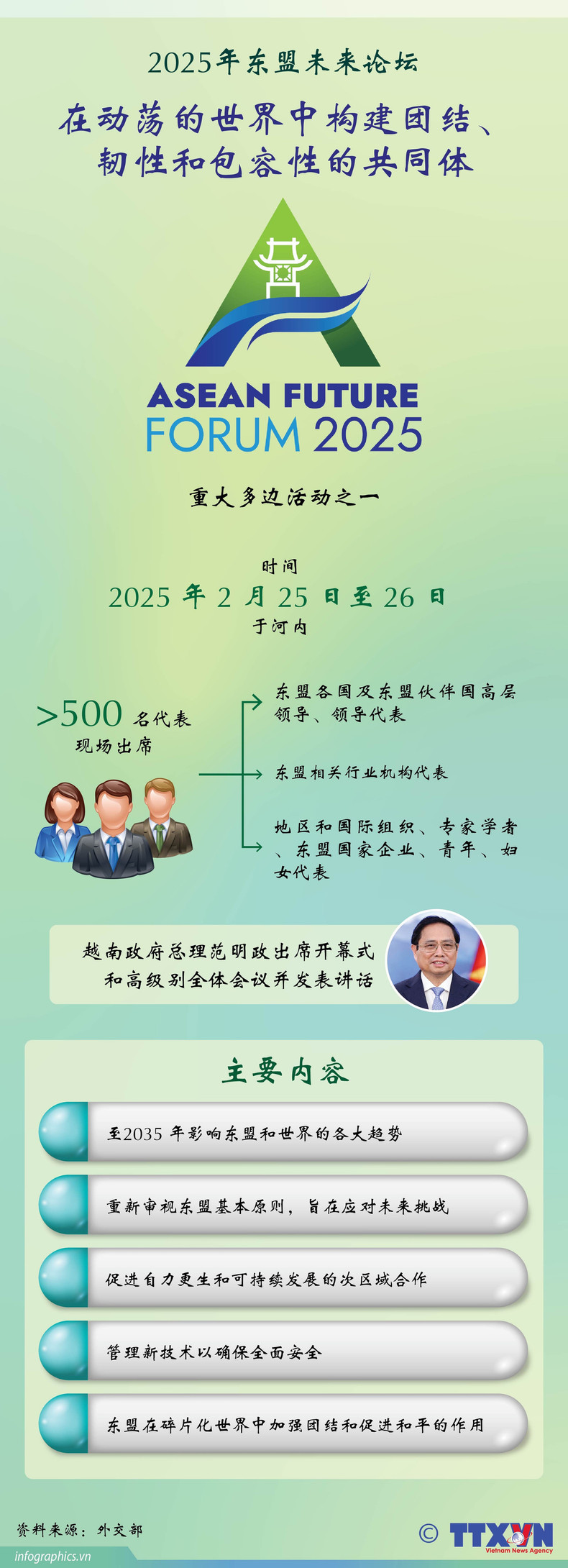 2025东盟未来论坛是越南2025年主办的最大多边活动之一。论坛将于2025年2月25日至26日在河内举行,主题为“在动荡的世界中构建团结、韧性和包容性的共同体”。