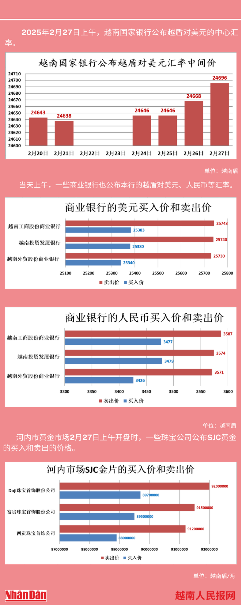 2025年2月27日上午,越南国家银行所公布的越盾对美元的中心汇率为24696。