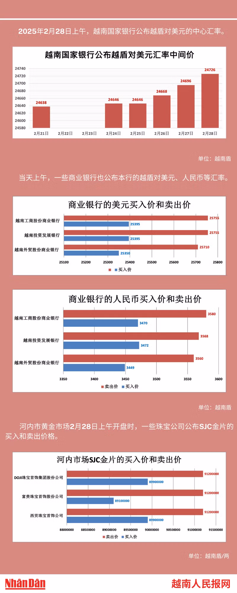 2025年2月28日上午,越南国家银行所公布的越盾对美元的中心汇率为24726。