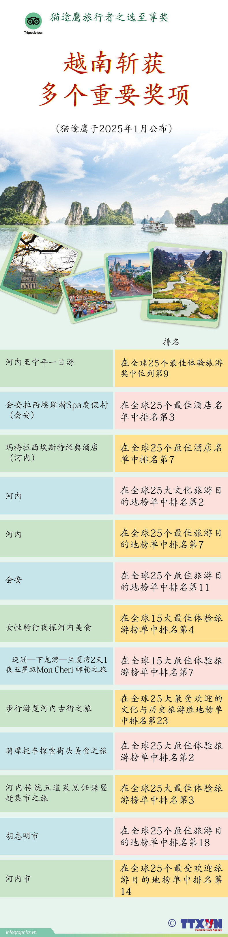 近日,世界领先在线旅游平台猫途鹰(TripAdvisor)的旅行者之选奖最佳目的地奖项公布了2025年奖项类别。据此,越南斩获多个重要奖项。