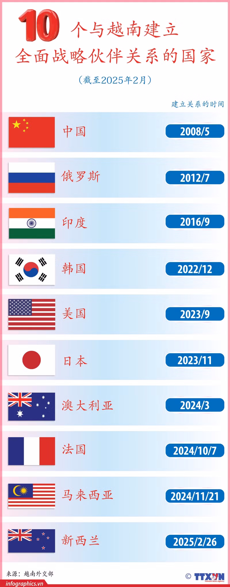 截至2025年2月,越南与10个国家建立全面战略伙伴关系【图表新闻】