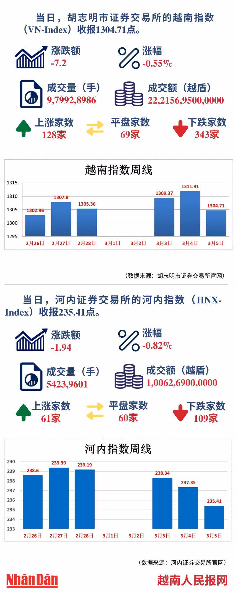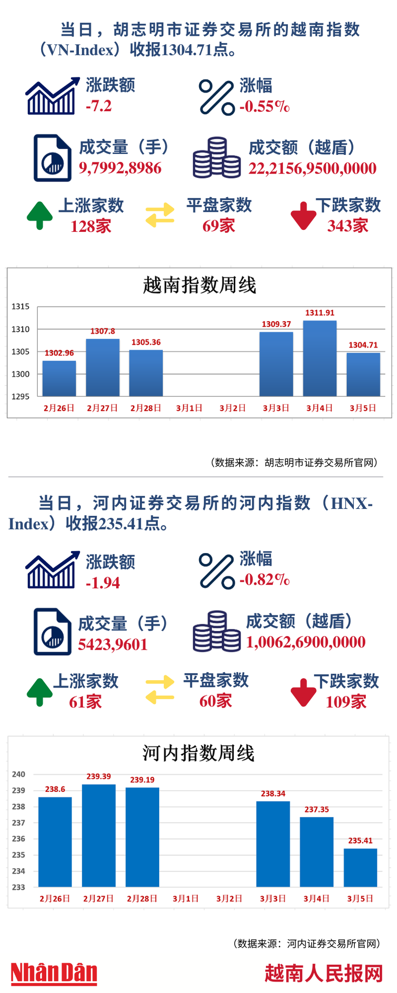 当天,胡志明市证券交易所的越南指数(VN-Index)和河内证券交易所的河内指数(HNX-Index)分别收报1304.71点和235.41点。