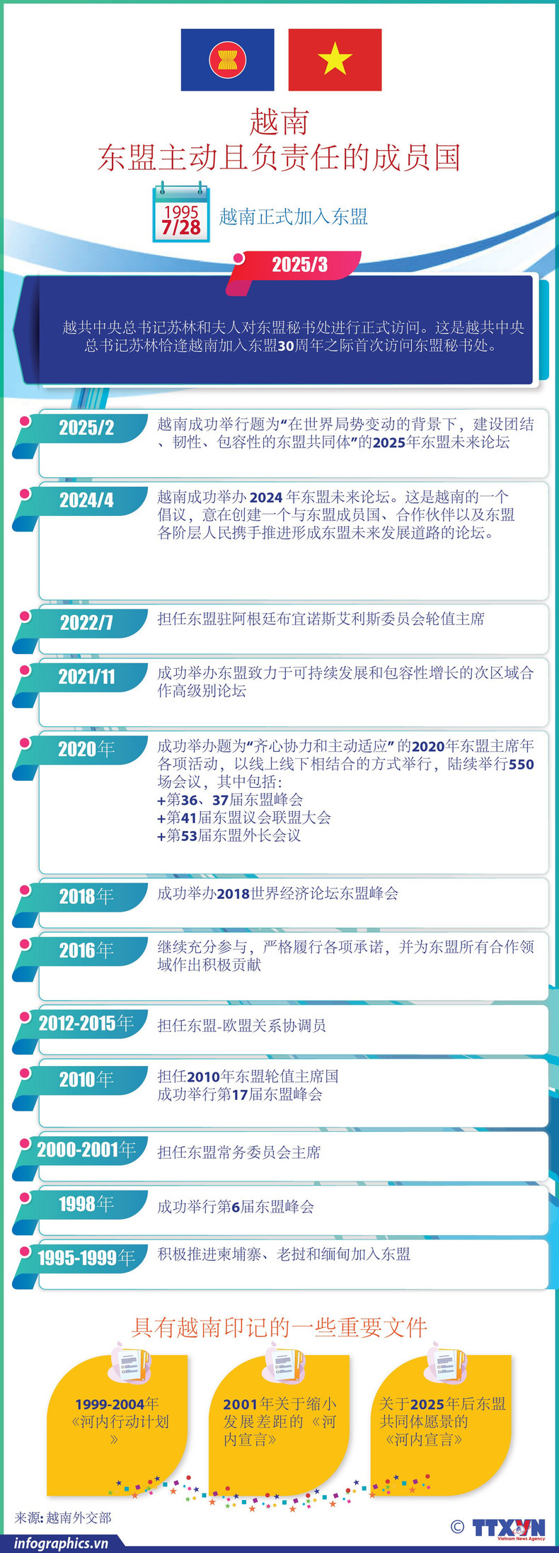 1995年加入东盟以来,越南已作出许多切实贡献,给东盟及其成员国留下了深刻烙印。30年来,本着积极主动和负责任的精神,越南一直与东盟成员国肩并肩,努力维护团结统一,发挥“共同家园”的核心作用,致力于地区乃至世界的和平、稳定、合作与发展。20世纪90年代末,从为了扩大成员规模推动组建东盟10国,到2001年关于缩小发展差距的《河内宣言》、《1999 - 2004年河内行动计划》、《东南亚无核武器区条约》(SEANWFZ)、关于2025年后东盟共同体愿景的《河内宣言》等,越南在“共同家园”留下的印记为东盟30年以来战略决策的形成作出了切实贡献。