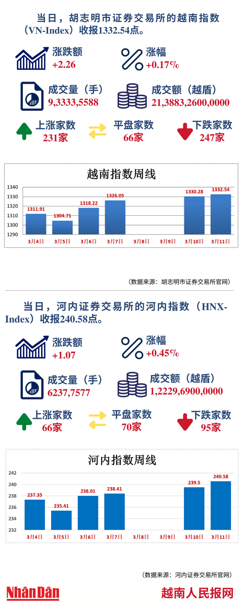 当天,胡志明市证券交易所的越南指数(VN-Index)和河内证券交易所的河内指数(HNX-Index)分别收报1332.54点和240.58点。