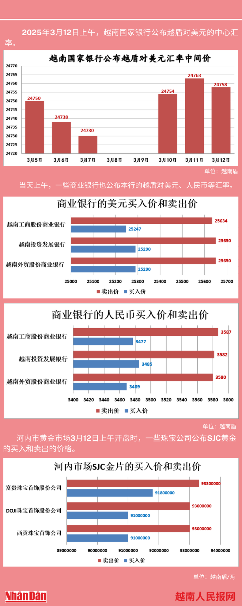 2025年3月12日上午,越南国家银行所公布的越盾对美元的中心汇率为24758。