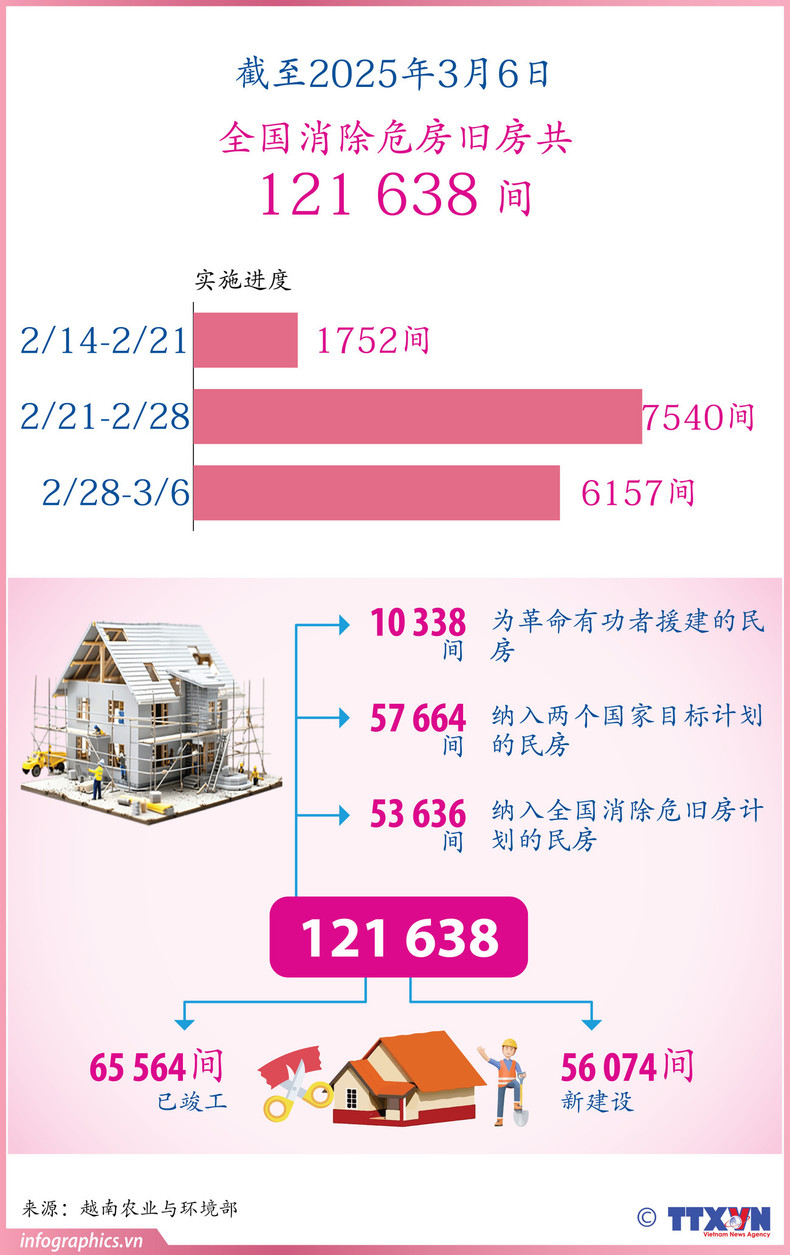 据农业与环境部统计,截至2025年3月6日,全国各省市累计支持消除121638间危旧房,其中65564间已竣工投入使用,另有56074间新房正在建设中。