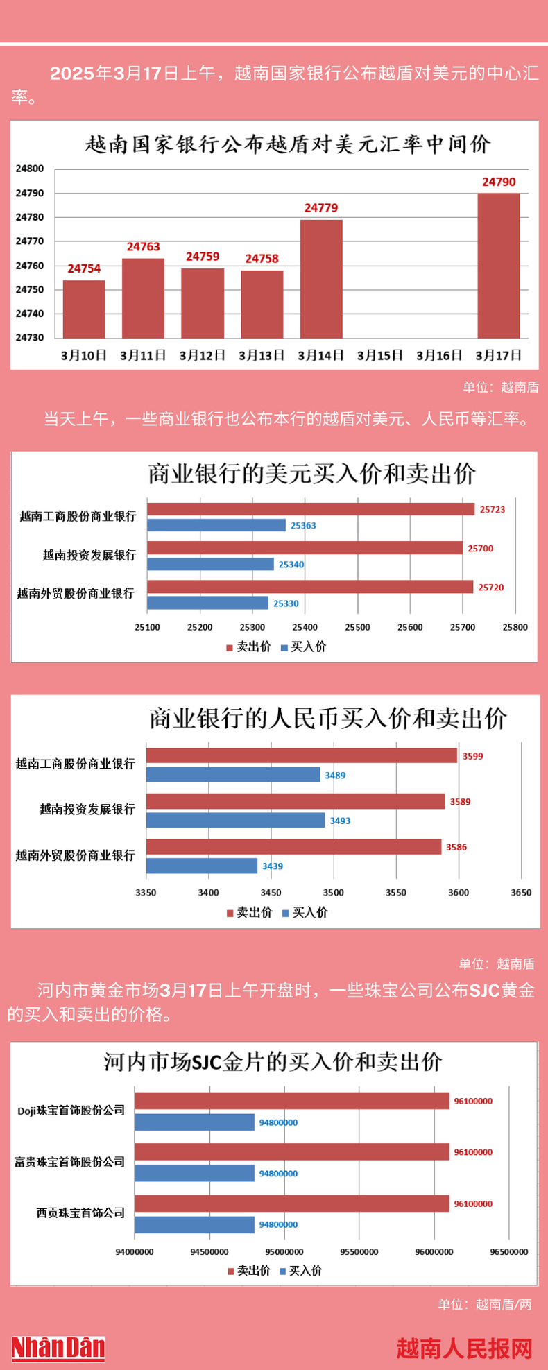 2025年3月17日上午,越南国家银行所公布的越盾对美元的中心汇率为24794。
