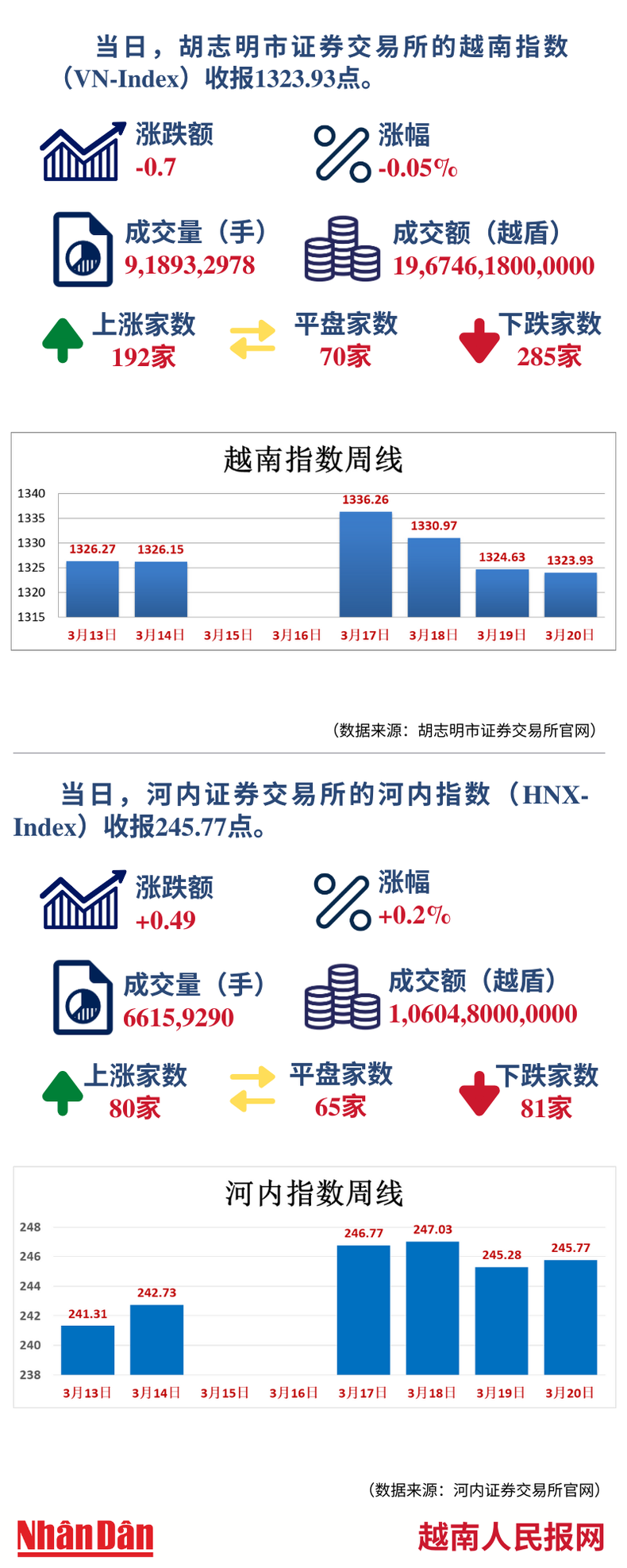 当天,胡志明市证券交易所的越南指数(VN-Index)和河内证券交易所的河内指数(HNX-Index)分别收报1323.93点和245.77点。